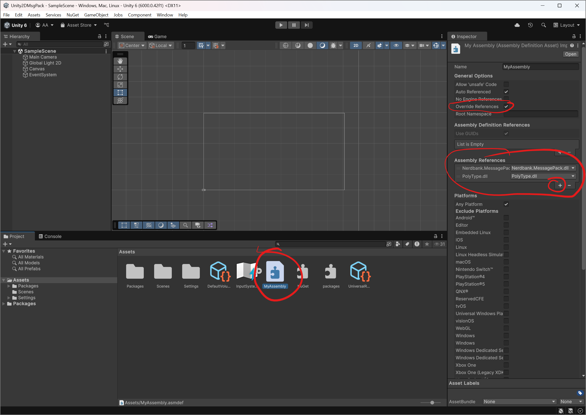 - Within the Unity editor, create an Assembly Definition or select your existing one.